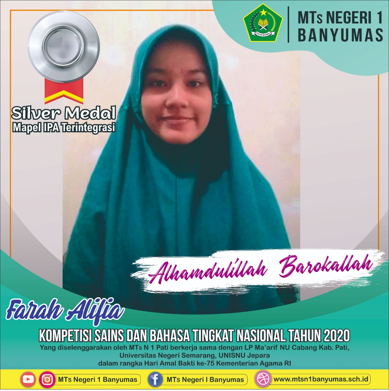 1. Farah Alifia (kelas IX B) peraih medali perak pada mapel IPA Terintegrasi;