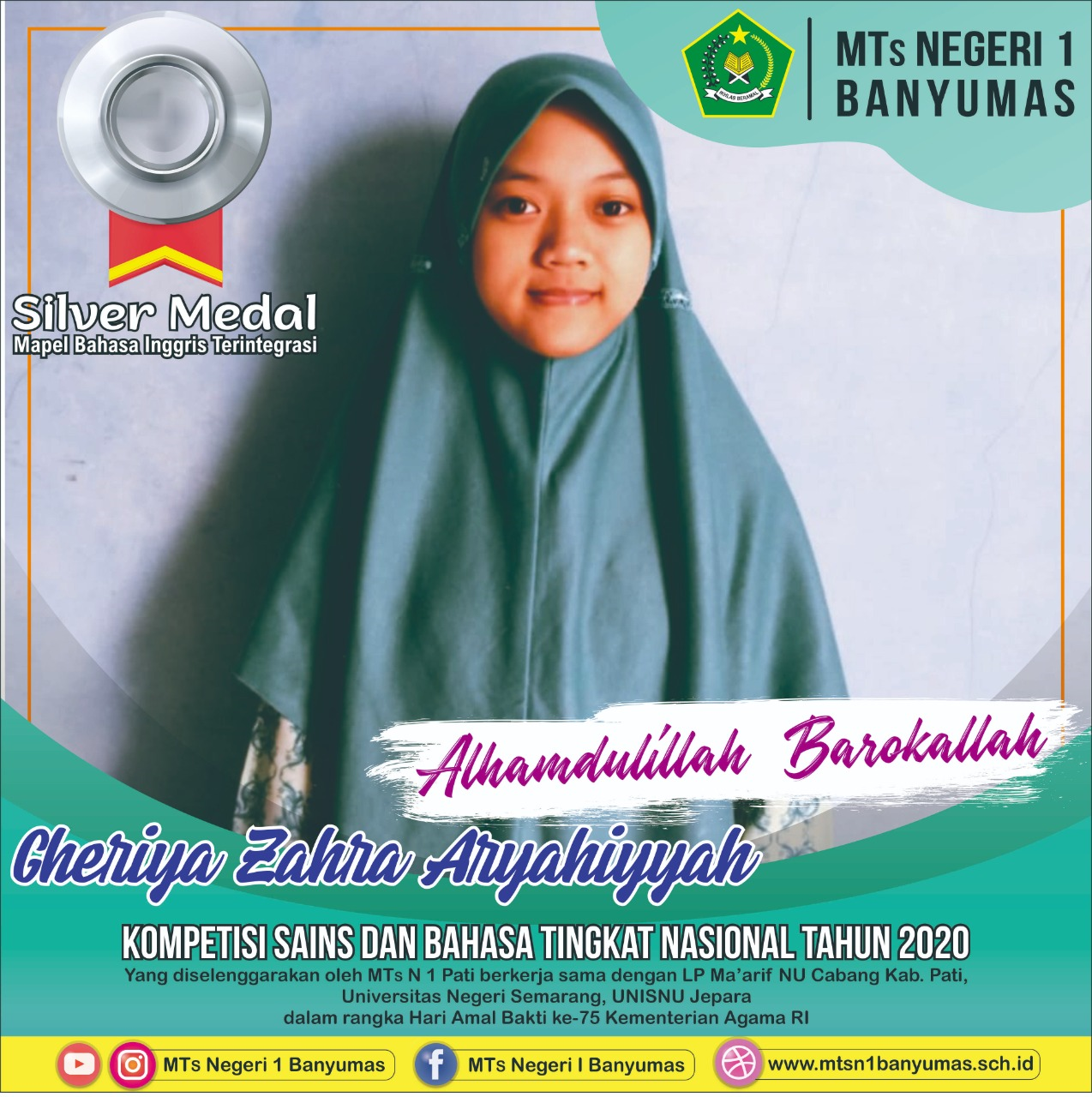 3. Gheriya Zahra Aryahiyyah (kelas IX A) peraih medali perak pd mapel Bhs. Inggris Terintegrasi;