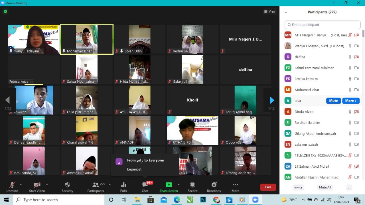 Matsama MTs Negeri 1 Banyumas dilaksanakan selama 3 hari, mulai dari hari senin, 12 Juli 2021 sampai dengan 14 Juli 2021. Mengingat masih dalam keadaan pandemi, maka kegiatan ini dilaksanakan secara Virtual melalui aplikasi Zoom, Wa, Google Form dan juga Youtube.