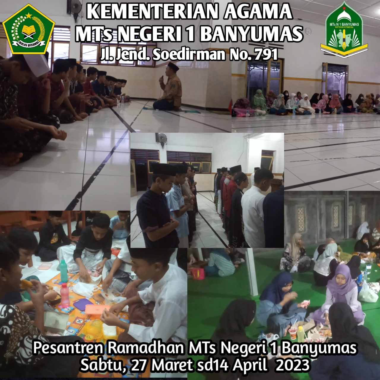 Bulan ramadhan adalah bulan penuh berkah dan maghfiroh dari Allah Swt, bulan yang sangat mulia untuk membentuk manusia beriman dan bertakwa kepada Allah Swt. Momentum bulan ramadhan ini tidak dilewatkan begitu saja, melalui berbagi kegiatan MTs Negeri 1 Banyumas berupaya mengisi bulan penuh hikmah ini dengan berbagai kegiatan seperti kegiatan pesantren ramadhan yang diselenggarakan selama 15 hari, mulai Sabtu, 27 Maret sampai dengan 14 April 2023 dengan peserta seluruh siswa MTs Negeri 1 Banyumas baik kelas 7,8 maupun 9 secara terjadwal bergantian termasuk Bpk/Ibu Guru dan Karyawan selaku pendamping kegiatan.